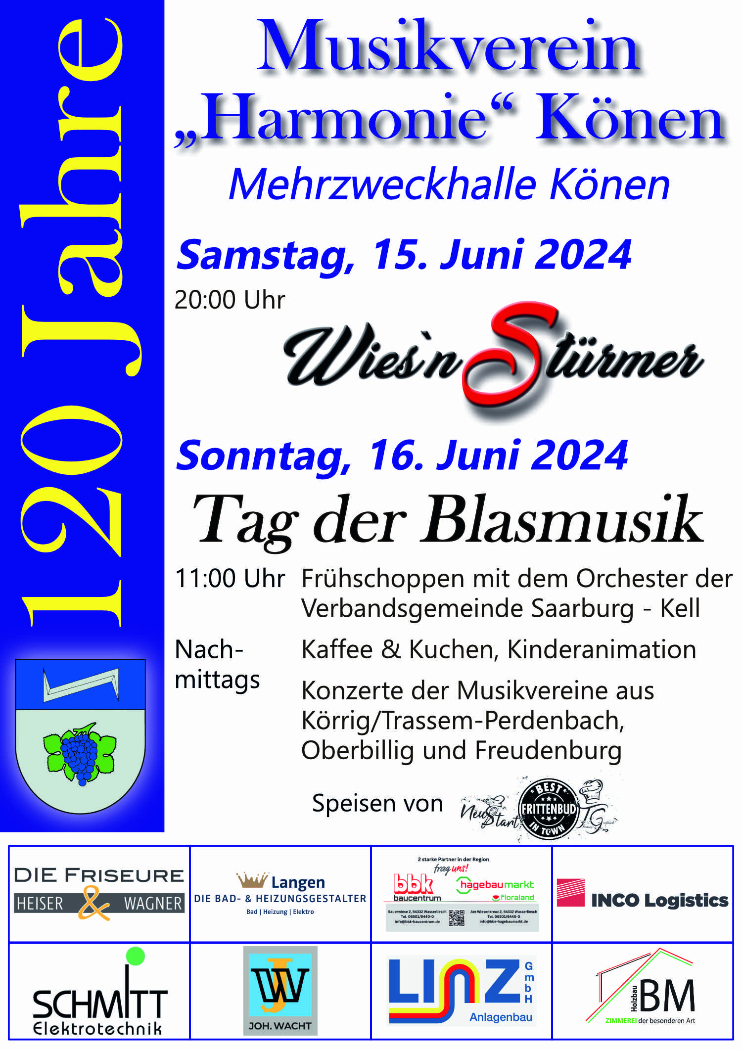 Wir möchten uns bei den Musikerinnen und Musikern für ihren Einsatz bei den Proben, Auftritten und Veranstaltungen und natürlich bei allen Mitgliedern für Ihre Treue zum Verein bedanken. Besonders freuen wir uns über die zahlreichen Jugendlichen, die eine Instrumentalausbildung begonnen haben. So können wir der Zukunft zuversichtlich entgegen sehen.Ein ereignisreiches Jahr liegt hinter uns. Der Musikverein feierte sein 120-jähriges Bestehen mit dem Jubiläumskonzert unter der Leitung von Robin Claes, das für Begeisterung bei den vielen Zuhörern sorgte. Im juni folgte die Geburtstagsfeier mit einem grandiosen Konzert der Wies'nStürmer und einem Tag der Blasmusik, der viele Gäste aus Könen und Umgebung in die Festhalle lockte.